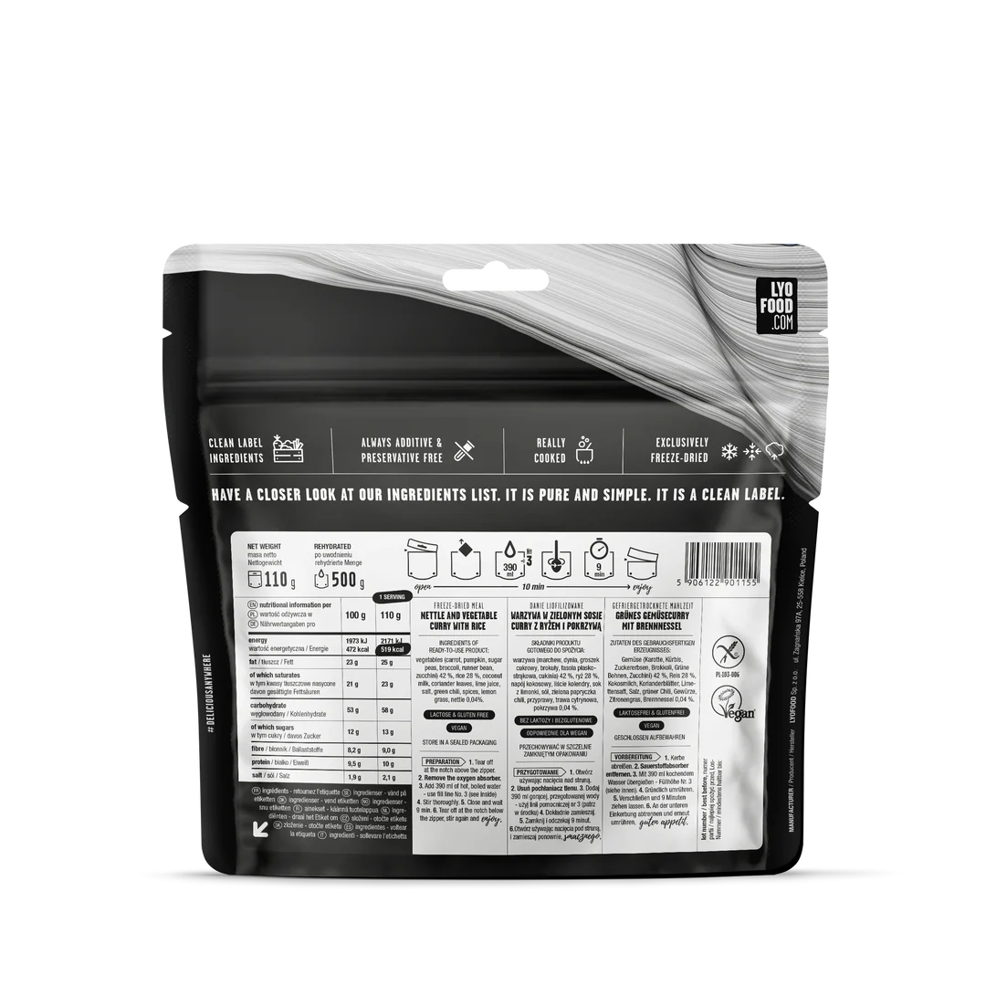 This vegetarian, gluten-free nettle green curry, created by one of world's famous climbers, will delight every taste. Delicate coconut milk, topped with lime juice and spiced with chili, coriander, lemon grass and Sean's favorite, the nettles. It creates a sauce that will remain in your memory for a long time. All of this served with large pieces of vegetables and rice. A healthy, filling, balanced meal with natural ingredients. Take it with you when you start off your new adventure!