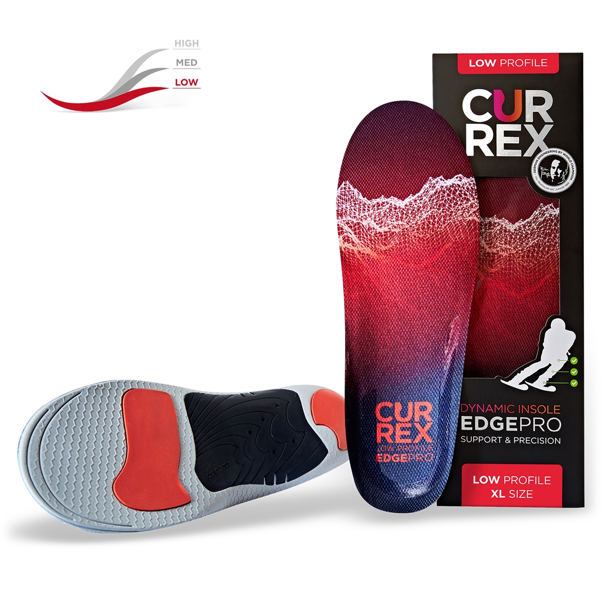 Our currexSole EDGEPRO ski insoles are the perfect answer to 100’s of ski boot fitting problems. They do this by guiding and accommodating the foot within the boot, giving better pressure distribution. This has a positive effect on the entire kinetic chain and thus reduces strain on your ankles, knees, hips and lower back as you ski. Our currexSole EDGEPRO ski insoles will help you with your balance, enable you to transfer your weight more smoothly and provide instant improved control over your ski. Whether you are a beginner or a seasoned expert – currexSole EDGEPRO insoles will help to make uncomfortable boots a thing of the past. The Low Profile EDGEPRO Insoles are suitable for feet that have a low arch profile.