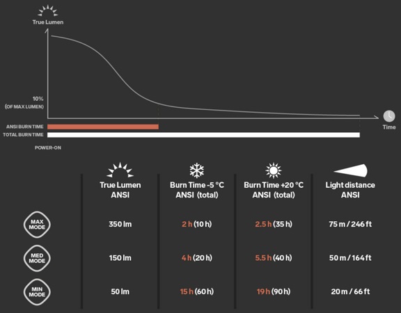 Light output and light distance: 350 True Lumen and 75 metres