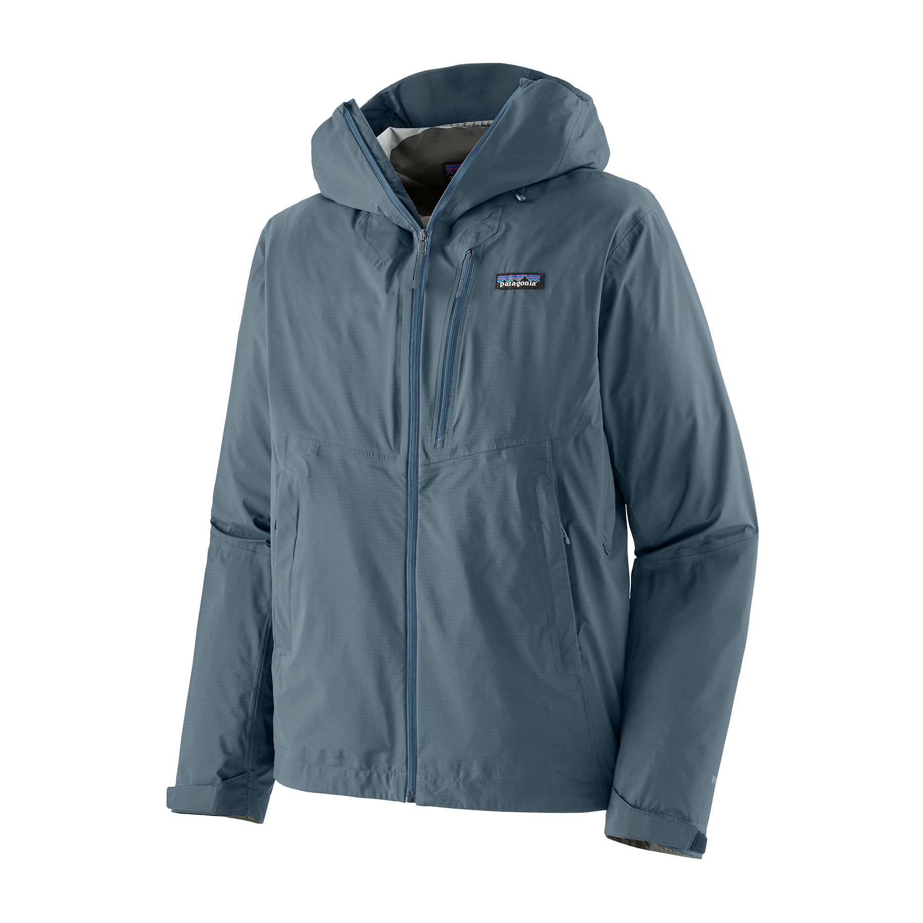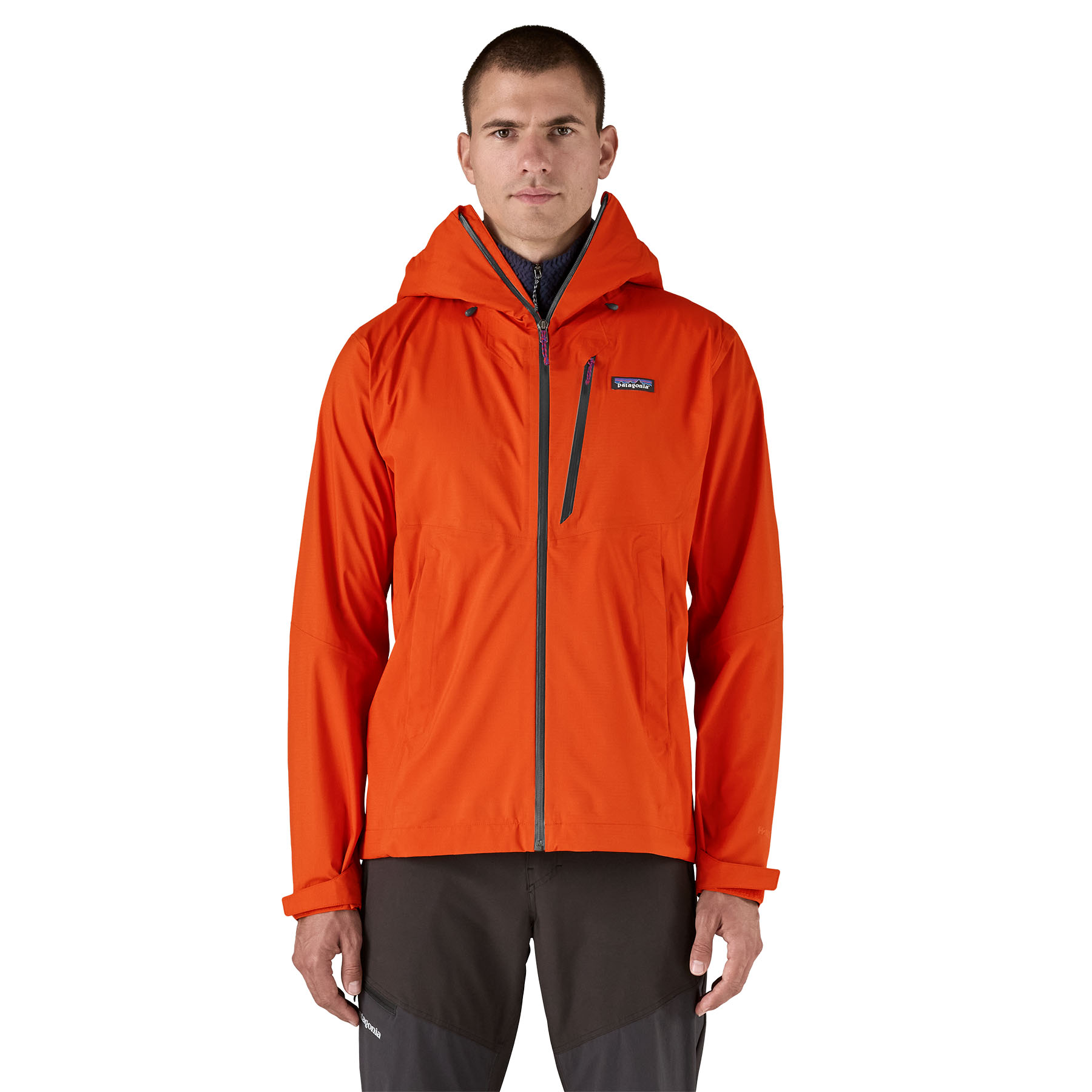 Center-front zipper and a chest pocket have watertight zips and zipper garages; two welted handwarmer pockets stay clear of a pack waistbelt or a harness