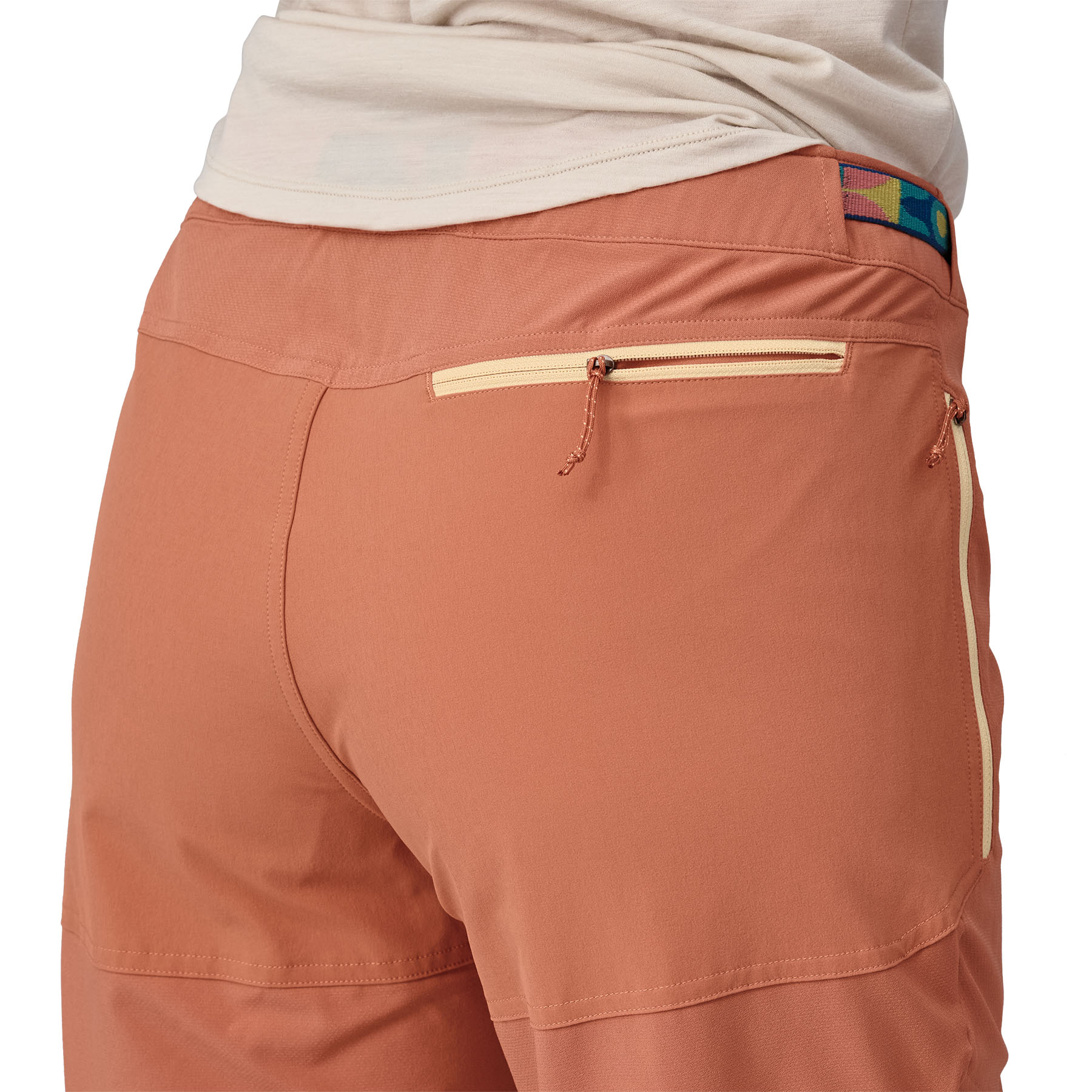 Low-profile waistband with separating zip fly and integrated adjustable belt ensures precise fit and stays comfortable under a harness or a backpack waistbelt