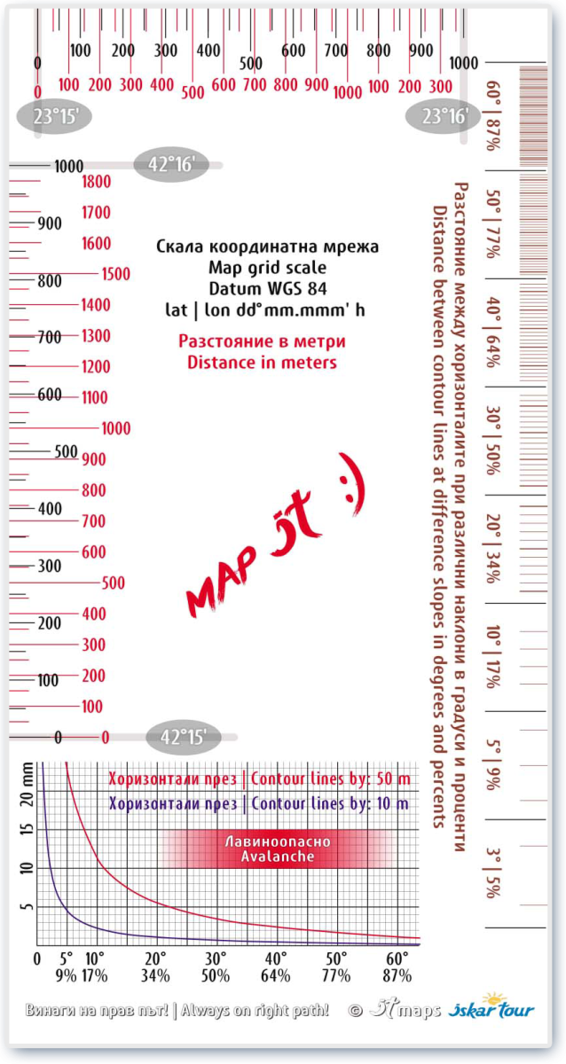 The map again is in 100% transparent PVC pocket and the new is, that the pocket has a hole at the top, short side. To the edition, we have implemented a new scale line with a graduated scale, for easy measurement of distance, a graduated scale from 1 decimal arc minute, for easy measurement of geographic coordinates and scale with distance between contour lines, for measure the angle of the slope, in degrees and percentage.